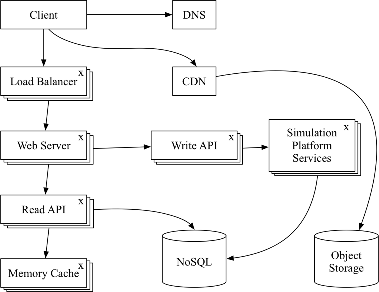 Для реализации приложения предлагается использовать микросервисную архитектуру. На рис. 1 показана схема основных сервисов архитектуры веб-приложения [2]. Ядром приложения является Simulation Platfrom Services, состоящий в свою очередь из набора микросервисов, реализующих задачи вычисления заданных электромагнитных параметров модели печатного узла [3]. Client – веб-браузер. DNS – система доменных имен. CDN – сеть доставки статического контента, а именно частей приложения, исполняющихся внутри клиента (браузера). Load Balancer – балансировщик нагрузки, распределяющий запросы от клиента к доступному веб-серверу. Web Server – веб-сервер, осуществляющий обработку HTTP-запросов (hypertext transport protocol) и вызывающий внутренние вызовы API. Write API – реализует методы и функции, приводящие к записи или изменении данных. Read API – реализует методы и функции, необходимые только для чтения данных. Memory Cache – автоматически обновляемый кэш наиболее часто востребованных данных, реализуется в виде базы данных, хранящая все данные в оперативной памяти. NoSQL – нереляционная база данных, организованная по принципу хранилища документов (document store). Object storage – хранилище объектов, распределенная файловая система. Сервисы, отмеченные символом «x» работают в кластере.