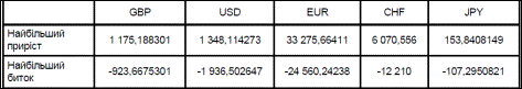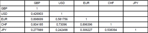 Отже, з табл.4 спостерігаємо, що найбільш тісний зв'язок між валютами EURі GBP- 0,898699, та між EURі CHF- 0,896396. Найменш тісний зв'язок у валют USDі JPY- 0,242498.
