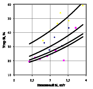 Исследовалось влияние замены ферросилиция ФС65 и части чушкового алюминия сплавами ФСА на степень усвоения кремния и алюминия [2]. На рисунке 2 приведена зависимость угара кремния при раскислении от суммы введенного кремния, с учетом кремния из СМн17, на примере стали марки 3сп.