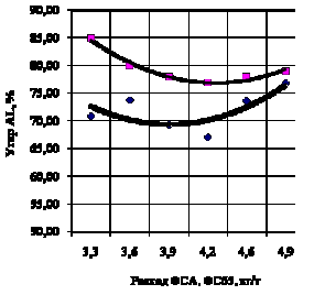 Как видно из графика на рисунке 2, увеличение расхода сплавов ФСА выше оптимума приводит к повышенному угару кремния. Примерно такая же динамика угара у кремния, внесенного из ферросилиция ФС65. Однако, угар кремния у сплавов с ФСА выше, чем у кремния внесенного ферросилицием, что возможно является следствием разности удельных весов ФСА и ФС, приводящим к активному взаимодействию ФСА со шлаком или, что более вероятно, это связано с повышением раскислительной способности кремния, вводимого в составе комплексного сплава совместно с алюминием [3]. Последнее подтверждается зависимостями на рисунке 3, 4 выведенными по уравнениям зависимости концентрации алюминия в готовом металле от введенного суммарного кремния.