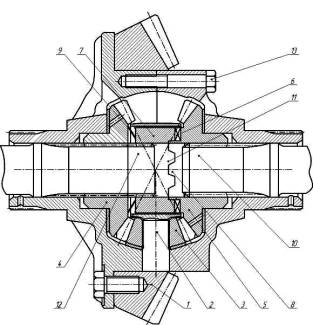 центральное кольцо; 9 - диафрагменная пружина; 10, 12 – полуоси; 11 – зубья