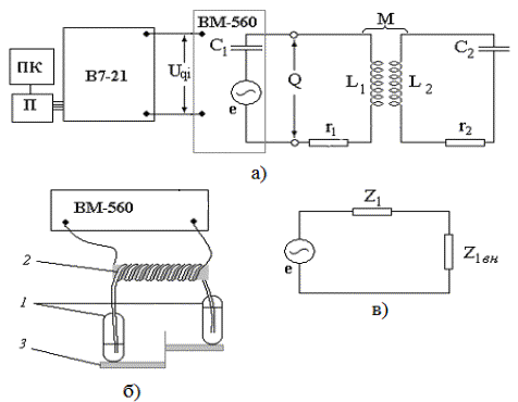 Рис. 1. а). Електрична схема зв'язаних контурів; б). Капілярний соленоїд; в). Еквівалентна схема зв'язаних контурів