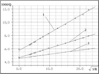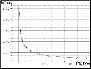 Залежність скін-шару y=h(R)/rк від оберненого опору рідин х=1/R (ГОм-1) для трьох частот: Δ - f1=400