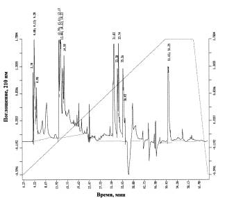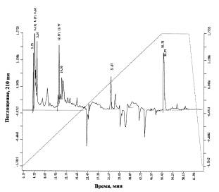 скорость элюирования: 0,5 мл/мин; детекция при λ = 210 нм. Пики с временами удерживания 3,75 мин (вместо