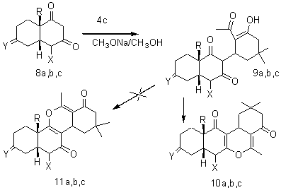 1,3-циклогександионы 1,3-декалиндионы (8a,b,c) в присутствии метилата натрия легко вступают в