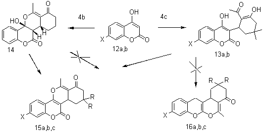 4-оксикумаринами (12a,b) протекает по типу михаэлевского присоединения давая