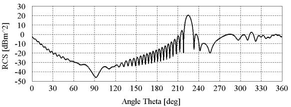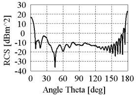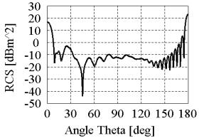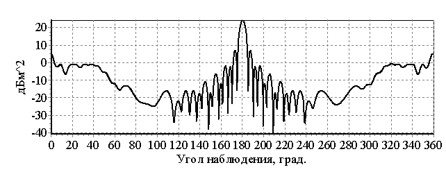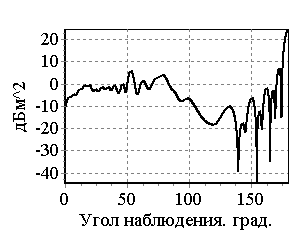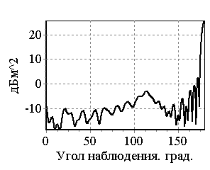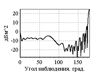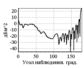 Для оценки уровня рассеяния в обратном направлении удобно использовать диаграмму обратного рассеяния (или однопозиционную диаграмму рассеяния). На рис.4 показана однопозиционная диаграмма рассеяния, т.е. зависимость ЭПР в направлении, обратном направлению распространения облучающей ЭМВ. Из рис. 3а и рис.4 следует, что при облучении, например, под углом Qq=0 ЭПР в обратном направлении равна 5 дБм^2, а по направлению распространения облучающей ЭМВ равна 25 дБм^2.