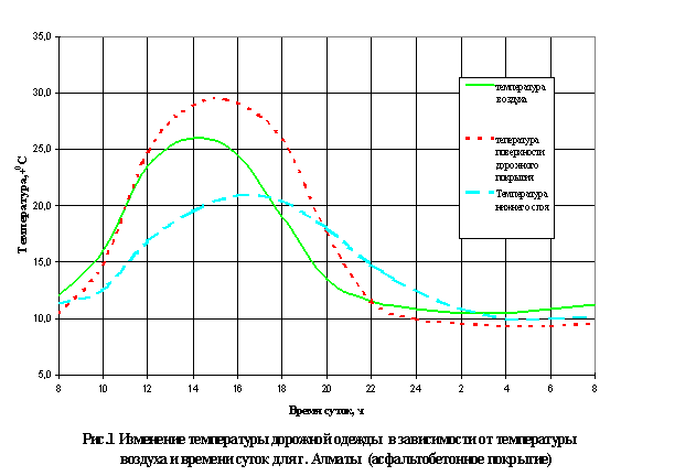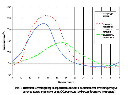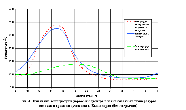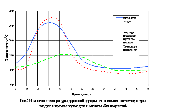 Изменение температуры поверхности дорожной одежды с асфальтобетонным покрытием происходит интенсивнее, чем изменение температуры поверхности без асфальтобетонного покрытия для обоих городов. Это связано с теплоемкостью поверхности дорожной одежды. Теплоемкость асфальтобетонного покрытия ниже, чем природного гравия, который является верхним слоем дорожной одежды без асфальтобетонного покрытия. Это также объясняет и то, что максимальная разность температур воздуха и поверхности дорожной одежды с асфальтобетонным покрытием выше, чем без асфальтобетонного покрытия. Например, для города Алматы эти разности составляют 4-5оС и 1-2оС соответственно, а для Кызылорды - 6-7оС и 2-3оС. Это различие разности температур в городах можно объяснить и различными климатическими условиями городов.