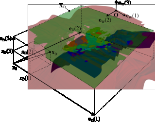 Положение x0, размеры и ориентация объемной решетки G3D в глобальном пространстве задается при помощи матрицы перехода W = (w(iM)), iM = (iM(i2D)), iM(i2D) = 1, 2, 3, 4, i2D = 1, 2 от локального базиса ED = (eD(i3D)) решетки G3D к глобальному ортонормированному базису EW = (eW(i3D)), eW(i3D, i3D) = 1 с общим началом ортов в опорном геодезическом пункте O = (0, 0, 0):