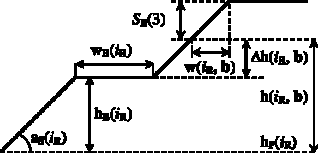 Основными параметрами уступа, показанными на рисунке 3, являются высотная отметка горизонта месторождения, высота и угол откоса, а также ширина предохранительной бермы. Значения данных параметров, обеспечивающие устойчивое положение борта карьера p, заданы для каждого типа пород iR при помощи табличных передаточных функций воксельной модели: hP = (hP(iR)), hB = (hB(iR)), aS = (aS(iR)) и wB = (wB(iR)) соответственно. С учетом функций тел горных пород R соответствующие параметры оказываются сопоставленными каждому узлу g3D объемной решетки G3D в зависимости от типа породы iR [1 – 3].
