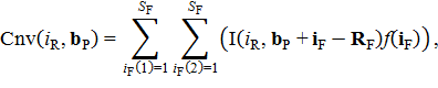 Приращение осуществляется за счет вычисления дискретной свертки пересечения I(iR, bP) и вещественной дискретной функции оператора генерации участка борта карьера, который представляет собой квадратный матричный фильтр f = (f(iF)), iF = (iF(i3D)), iF(i2D) = 1, 2, …, SF, iF(3) = 1 обработки горизонтального слоя объемного изображения. Матрица оператора имеет нечетную размерность SF, которая определяется по радиусу оператора RF: