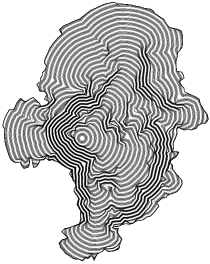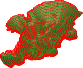 Результат построений показан на рисунке 5. Внешняя линия является пересечением с рельефом земной поверхности. Устойчивая конфигурация борта карьера точно прослеживает геологическую ситуацию на участке недр. Для построения использовалась модель с размерами 1024 x 1024 x 175 вокселей, показанная ранее на рисунке 1. Размеры вокселя составляли 2 x 2 x 2 метра. Среднее время генерации всего борта карьера составило 0,27 секунды на персональном компьютере со следующей конфигурацией: материнская плата ASRock X58 Extreme; процессор Core i7 920 (2,8 ГГц); память PC3-10666 Hynix (4 ГБ); видеокарта GTX 580 (GV-N580SO-15I); жесткий диск Corsair CSSD-F60GB2 (60 ГБ); операционная система Windows 7 Home Premium x64.