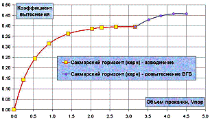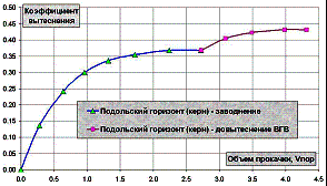 вытеснения от объема прокачанного флюида при заводнении и последующем