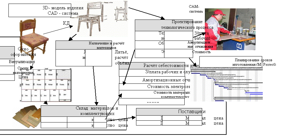 Далее конструктором с помощью CAD-системы формируется чертёж выбранной модели, содержащий все необходимые параметры изделия. По этим параметрам осуществляется определение назначения и расчёт объёма материала, необходимого для изготовления заказа. Современные CAD-системы позволяют выполнить точный расчёт листового материала, и, следовательно, закупить необходимое его количество, а также выполнить рациональный раскрой. С использованием информационной системы появляется возможность установить наличие необходимых материалов и комплектующих на складе, а если они отсутствуют, то установить возможность их заказа у поставщиков с определением цены материалов. Полученная информация о цене и объёмах материалов поступает в модуль расчёта себестоимости заказа. На следующем этапе осуществляется проектирование технологического процесса, при котором определяются необходимые для производства ресурсы: станки, инструменты, рабочие. Для автоматизации разработки технологического процесса чаще всего используются CAM-системы [1]. Данные технологического проекта позволяют рассчитать заработную плату рабочих, амортизационные отчисления, затраты электроэнергии. Экономисты при получении всей необходимой информации рассчитывают себестоимость изделия и определяют его цену. Планирование сроков исполнения заказа может быть выполнено с помощью программы MS Project [2]. Эта программа помогает менеджеру проекта при разработке планов, распределении ресурсов по задачам, отслеживании производственных процессов и анализе объёмов работ. Рассчитанные показатели стоимости и времени выполнения заказа сообщаются заказчику, если они его удовлетворяют, то заключается договор на производство продукции. В этом случае у разработчиков уже подготовлены основные документы, необходимые для производства заказанной продукции. Если же какие-то показатели изделия не удовлетворили заказчика, тогда процесс, начиная с изменения дизайна, выполняется заново. С учётом автоматизации всего процесса время расчёта будет небольшим.