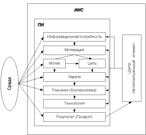 Здесь ИЭ – интеллектуальный элемент, ПИ – подсистема исполнения, ИП – информационная потребность, М – мотивация, З- задачи, А – альтернативы (решения), Тх – технологии, Пр – продукция (результат).