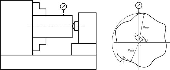 Расчетная схема контроля представлена на рис. 1. Положение датчика и эксцентриситет между геометрической осью А и осью вращения 0 детали (точнее – проекциями в поперечном сечении) будут переменными величинами как по модулю, так и по угловому положению. Отклонение от круглости d определяется по стандартной методике.