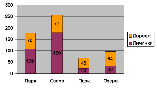 нами було відмічено всього личинок 109, а на озері – 180, відповідно дорослих –