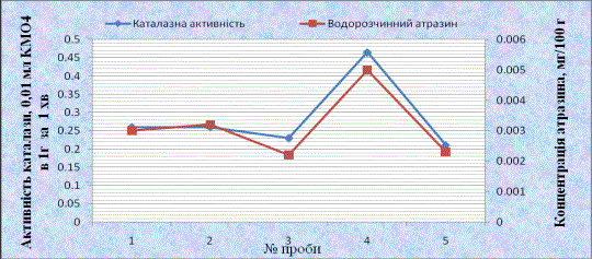 каталази та концентрації атразину (рис 2.) виявив прямо пропорційну залежність.