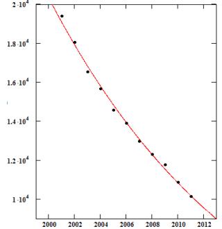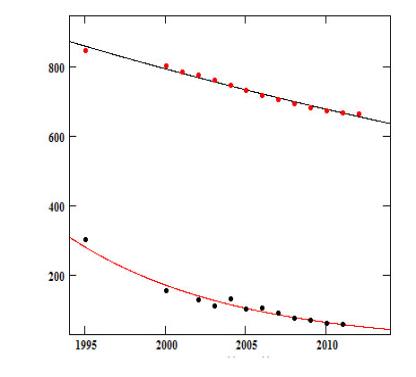 Як бачимо, існує два фактори (кількість зайнятого населення і кількість сільськогосподарської техніки), які мають найбільшу ступінь корельованості з динамікою зміни кількості сільського населення. Народжуваність відповідає обернено пропорційному, а смертність пропорційному співвідношенню до зміни кількості сільського населення, значить їх вплив можна вважати другорядним. Тому кількість (N) і зайнятість (Nз) сільського населення за 1995-2011 роки змінювалась також за експоненціальним законом (рис.2):