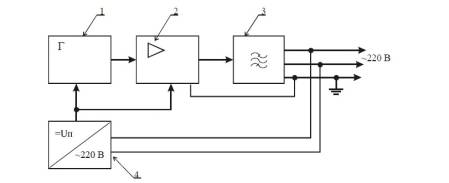 генератор шуму, 2 – підсилювач, 3 – фільтр для погодження з мережею 220В, 4 –