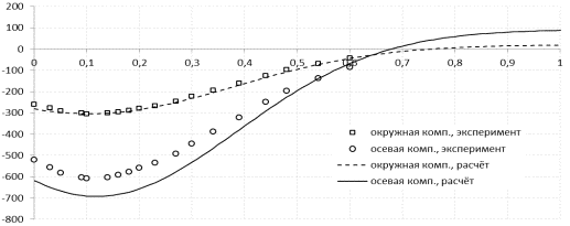 На рис. 1 представлены результаты восстановления НДС после проведения ППД с помощью обкатки роликом цилиндрических образцов из материала 30ХГСА. Наблюдается хорошее соответствие расчётных и экспериментальных данных. Аналогичная картина наблюдается и для других экспериментов.