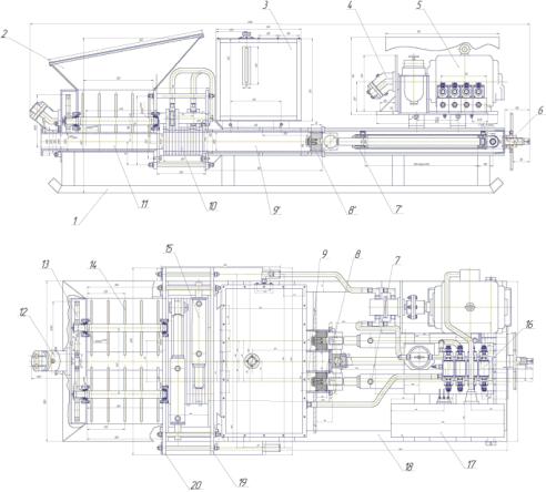 1- полозья; 2- загрузочный бункер; 3- бак для масла; 4- основной гидронасос; 5- элекродвигатель привода; 6- регулировочный винт; 7, 7’- силовой гидроцилиндр рабочего поршня; 8, 8’- рабочий поршень; 9,9’- рабочий цилиндр; 10- шиберный распределительный узел; 11- бетоновод; 12- гидромотор привода побудителя; 13- зубчатая передача привода побудителя; 14- вал с вертикальными стержнями побудителя; 15- гидроцилиндры управления перемещением шиберного распределительного узла; 16- блок гидравлического управления гидросистемой бетононасоса (гидрораспределители); 17- шкаф электрического управления бетононасосом; 18- рама; 19- задняя стенка корпуса бетононасоса; 20- передняя стенка корпуса бетононасоса.