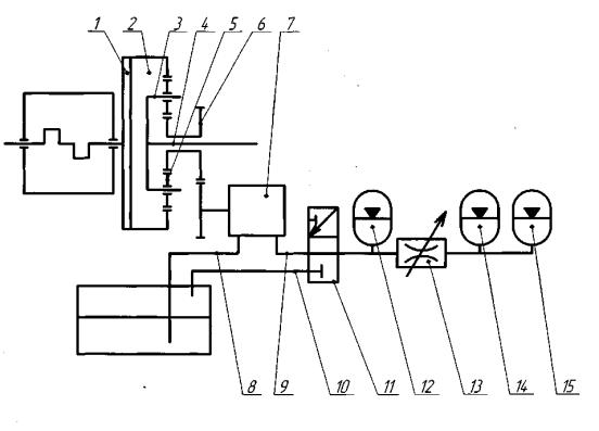 11-распределитель; 12,14,15-пневмогидревлические аккумуляторы;