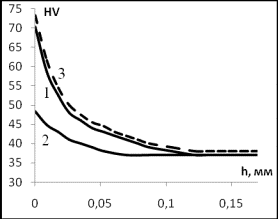 слоев (до 2-х раз). Постепенное убывание микротвердости распространяется до глубины