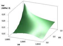 Как видно из рис. 3 здесь, при данных значениях переменных, 3D зависимость Vel постепенно падает с 0,25 до