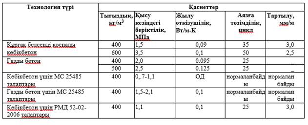 1 кесте. Автоклав газды бетон қасиеттері мен стандарт талаптарына сай