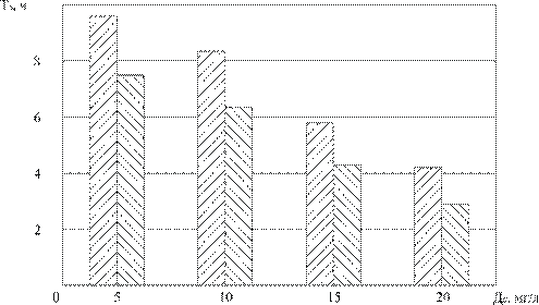 Рис. 1. Диаграммы времени защитного действия фильтра по нефтепродуктам при различных дозах и режимах ввода сорбента: