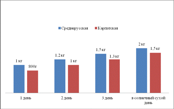 кг, на третий день 29,7 кг в солнечный сухой день 31,7 кг [1].