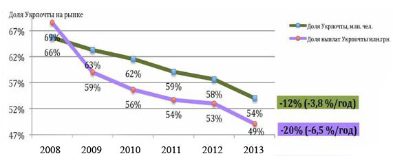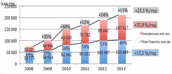 год) нижче ніж, темпи зростання загального обсягу виплат в Україні (23,3% / год), що означає втрату частки Укрпошти на ринку даної