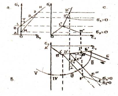 упругости I; зона пластического течения II; зоны одноосного и двухосного разрушения III-V. Причем, для