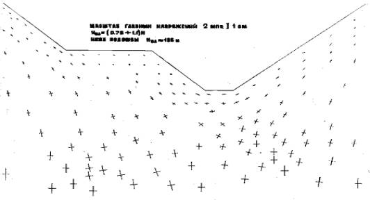 напряжений вдали от откоса на максимальном расстоянии (ниже подошвы-135м, справа откоса