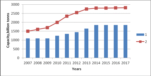 Pic.1. Forecast of production of petroleum coke in Russia (1) and the