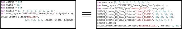 построения блочного элемента; слева – блок команд для уникальной САПР, справа –