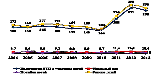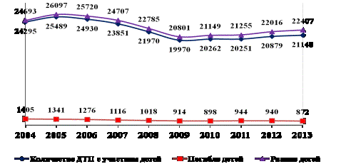 человек. На дорогах за 2004 - 2013 годы погибли 10724 ребенка в возрасте до 16 лет, травмированы 231630 детей (рис.1). Размер