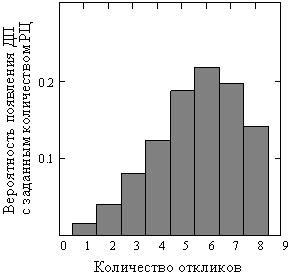 В таблице 1 представлены ряды распределения, а на рис. 6 гистограммы распределения числа откликов в ДП самолета А-319 при ограничении нормированного ДП снизу на уровне h=0,1. Анализ показывает, что максимальное несоответствие dp частот появления ДП с одинаковым количеством откликов составило dp=0,045, причем максимальная частота соответствует ситуации формирования ДП с 6-ю откликами, которых получено около 20 % от общего числа.
