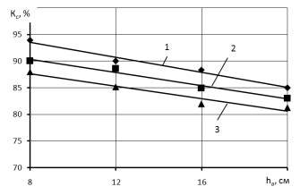 С увеличением глубины хода анкерных сошников от 8 до 20 см количество семян Кс, заделанных в горизонте, соответствующем средней глубине и два смежных 1 см слоя, уменьшается в 1,1-1,2 раза, рисунок 4. Увеличение скорости движения V от 8,2 до 12,1 км/ч приводит к снижению количества семян Кс, заделанных в горизонте, соответствующем средней глубине и два смежных 1 см слоя, на 5-7%. При этом, во всех вариантах глубины хода анкерных сошников hа и скорости движения V обеспечивается удовлетворяющее агротребованиям количество семян Кс, заделанных в горизонте, соответствующем средней глубине и два смежных 1 см слоя (не менее 80%).