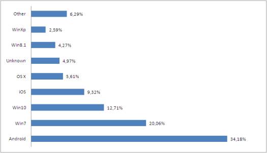 сдают свои позиции и находятся уже на втором месте, а Android находится на первом месте. Общая статистика операционных систем продемонстрирована на
