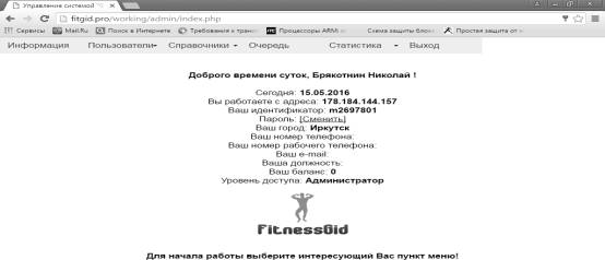 "FitnesGid" system the access to the administrative part is available