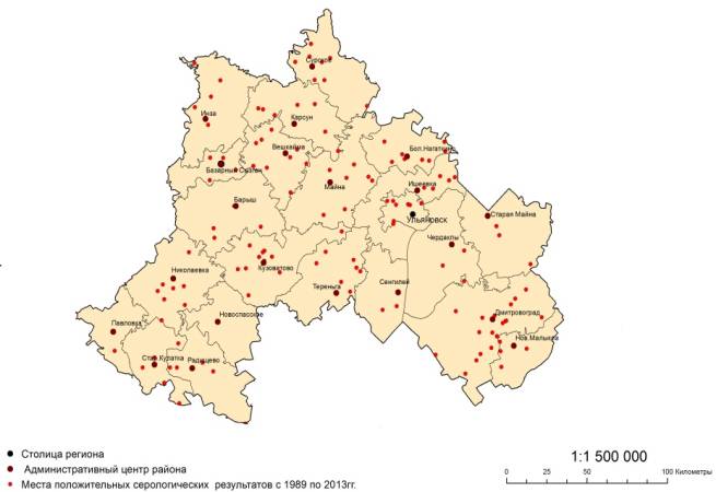 Территориально наибольшую опасность в отношении частоты встречаемости эпизоотий туляремии представляют: г. Димитровград – 18 положительных находок, Кузоватовский район – 11 положительных находок, Вешкаймский район – 9 положительных находок, Николаевский район, Большое Нагаткино, Сурский район и г.Ульяновск – 8 положительных находок (рис. 2.). Выделение этих территорий может послужить информационной защитой для жителей города и всей Ульяновской области, как показатель к соблюдению повешенных мер предосторожности [3].