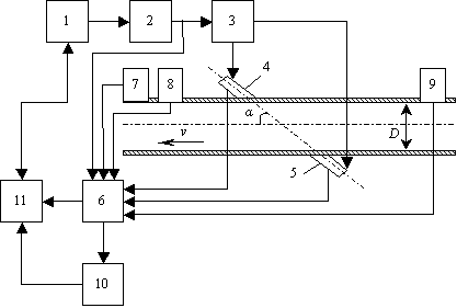 Для создания дополнительного контура контроля, а также повышения функциональных возможностей системы в целом, возможно введение в гидравлические каналы налива и слива жидких продуктов устройств поточного контроля параметров (УПКП). Структурная схема устройства представлена на рисунке 1. Устройство управления 1 подает сигнал на генератор 2, который формирует опорную частоту для формирователя зондирующих импульсов 3. Зондирующий импульс поступает на пьезоэлектрический преобразователь 4, установленный на стенке трубопровода. Ультразвуковой сигнал проходит сквозь жидкость, которая в данный момент времени протекает по трубопроводу со скоростью v, и улавливается через время t1 пьезоэлектрическим преобразователем (ПЭП) 5, установленным на противоположной стенке трубы. Данные о пришедшем на ПЭП 5 сигнале поступают на устройство сбора данных 6. В вычислительном устройстве 11 происходит вычисление времени прохождения данного импульса по выражению: