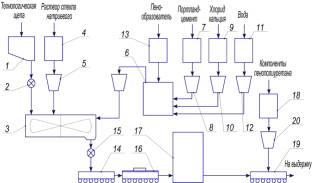 объемный питатель; 6 - пенобетоносмеситель ПБС-1000; 14 - формы; 16 -