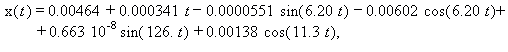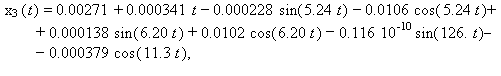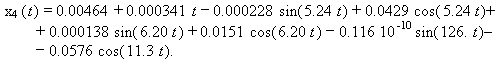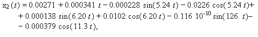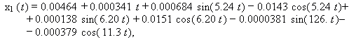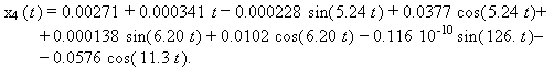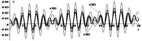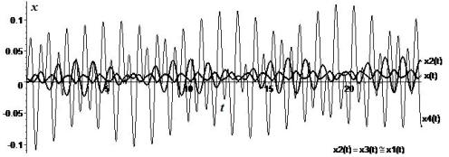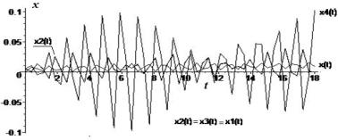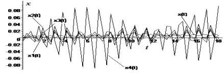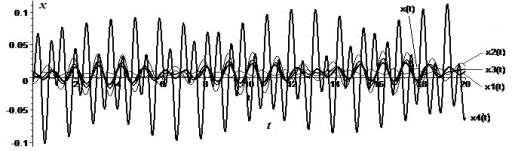 кг, m1=m2=m3=m4= 2.0 кг, c1=c2=c3=c4= 55.0 н/м, g1= 40p рад/с, gN=3.6pрад/с, F1= 1.2 н, FN = 11.5 н, a1=F1/m1= 0.6 м/с2, aN =FN/mN = 5.75 м/с2, w=3.3166 рад/с, w1= 5.244 рад/с, l1= 5.244 рад/с, l2= 6.2048 рад/с, z1=zN=2.75(рад/с)2. Перемещения x(t), x1(t), x2(t), x3(t), x4(t) отображены в виде графиков на рисунке