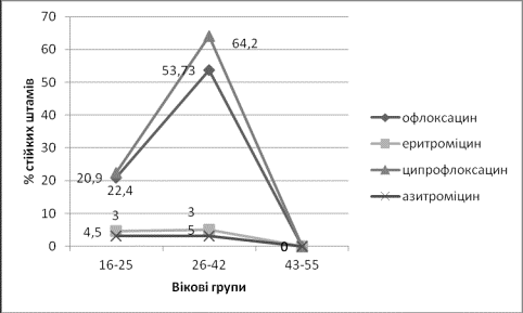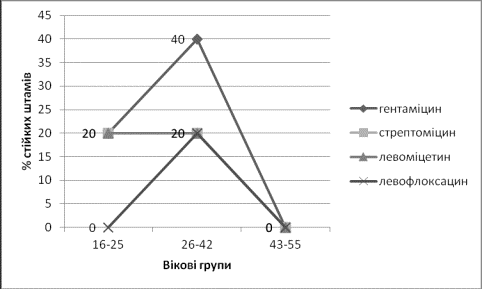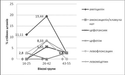 відношенню до хлорамфеніколу – 75%, в меншому ступені – до левофлоксацину – 50%. До ампіциліну стійкість проявлялась у 25 % штамів. Ізоляти