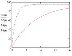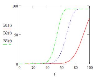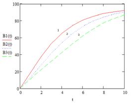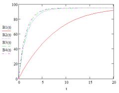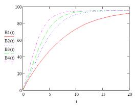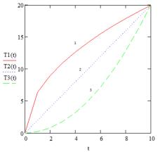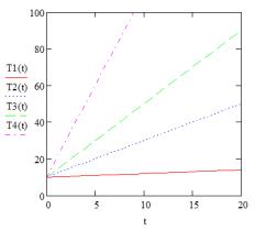 Рис. 3. Сравнительный график скорости роста цепи при радикальной полимеризации для разных температур, заданных как линейные функции, при различных начальных условиях