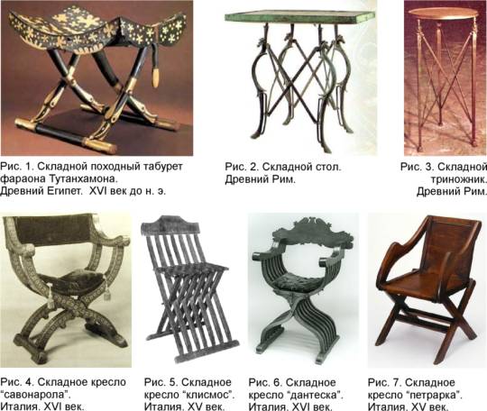 На протяжении веков на основе Х-образной конструктивной системы изготавливались складные табуреты, кресла и столы.