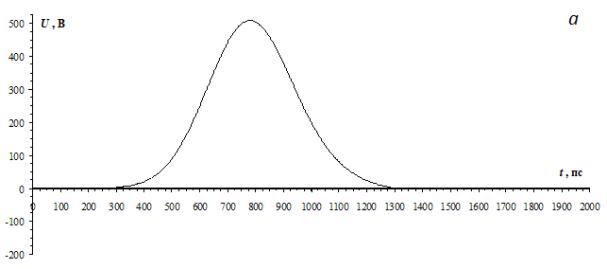 По результатам моделирования видно, что при ширине спектра воздействующего сигнала 0–2,3 ГГц в начале подключаемой линии (Uвх) сигнал на конце внешнего проводника (Uвых) отсутствует. Это объясняется тем, что длительность импульса, распространяющегося в подключаемой линии, больше, чем минимальная разность задержек мод результирующей структуры. При ширине спектра воздействующего сигнала 0–20 ГГц на конце внешних проводников появляются два импульса разной полярности. Таким образом, по наличию сигналов на конце внешних проводников можно обнаруживать импульсы в подключаемой линии без гальванической связи с ней.